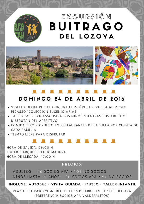 Por la mañana llegaremos a Buitrago sobre las 10.00am y realizaremos una visita guiada por la villa, que no mostrará su importancia estratégica como núcleo situado entre las dos mesetas con el conjunto fortificado más singular y mejor conservado de toda la comunidad de Madrid. Además, visitaremos el Museo Picasso donde podremos ver la «Colección Eugenio Arias» exposición permanente donada por Eugenio Arias, natural de la villa y amigo de Picasso durante el exilio en Francia. Después de las visitas los más pequeños podrán realizar un taller relacionado con Picasso mientras que los papas/mamas aprovechan para tomar el aperitivo…